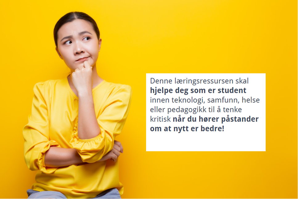 Læringsutbytte: I denne ressursen er læringsutbyttet å kunne tenke kritisk i møte med påstander om at det som er nytt, imponerende eller kostbart er bedre enn andre tiltak. Ressursen er tverrfaglig og retter seg mot påstander innen helse, utdanning, samfunnsfag eller teknologifag